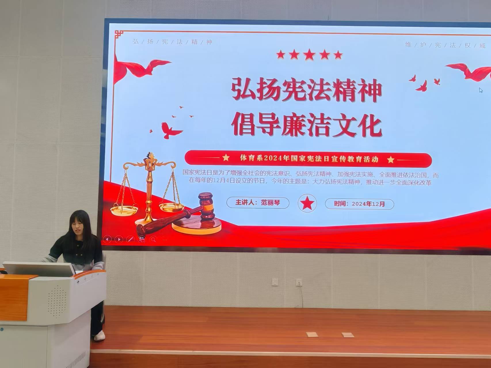 为提高我系学生法律意识,同时倡导廉洁文化宣传建设,共建廉洁学校。2024年12月4日,体育系组织全体学生开展“弘扬宪法精神·倡导廉洁文化”主题宣讲活动,通过法律宣讲和廉洁文化分享等方式,进一步营造教师、学生守法守廉的良好学校氛围。